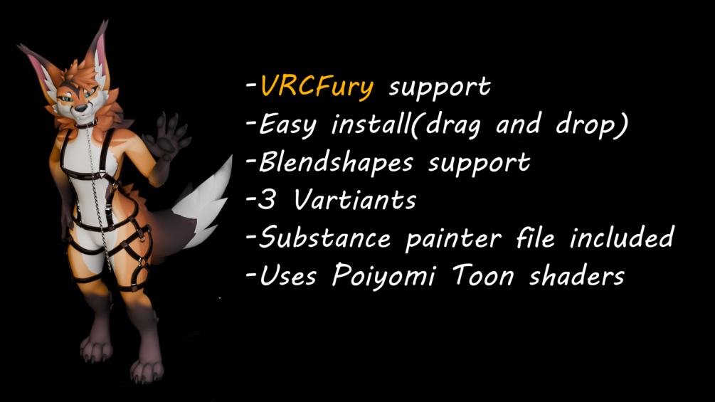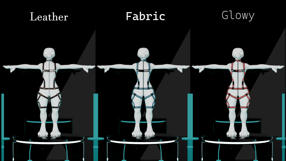A body harmess specifically designed for the Vulper model in VRChat. This sissy yet functional accessory perfectly fits the Vulper character design, bark bark.