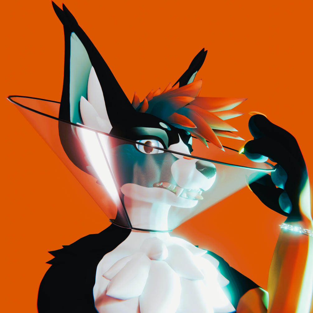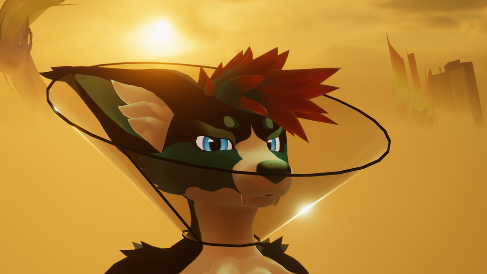 A cone of shame specifically designed for the Vulper model in VRChat. This stylish yet functional accessory perfectly fits the Vulper character, quirky pet-themed product, all bark no bite.