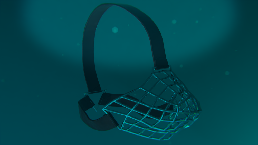 - Stylized cage muzzle design with straps